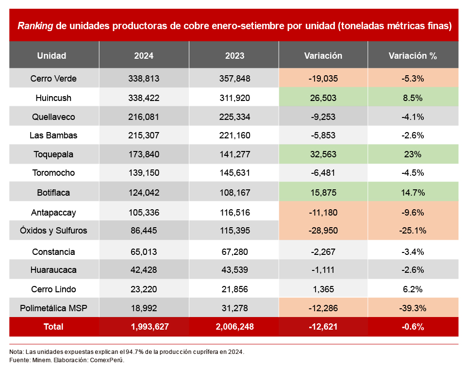 La menor producción de cobre se debió, principalmente, al menor dinamismo de las unidades de Óxidos y Sulfuros (mina Justa) operadas por Marcobre en Ica, cuya producción cayó un 25.1%. Otras minas que también influyeron en este resultado fueron Cerro Verde (-5.3%), en Arequipa; MSP (-39.3%), de la minera Shouxin, en Ica; y Antapaccay (-9.6%), ubicada en Cusco.