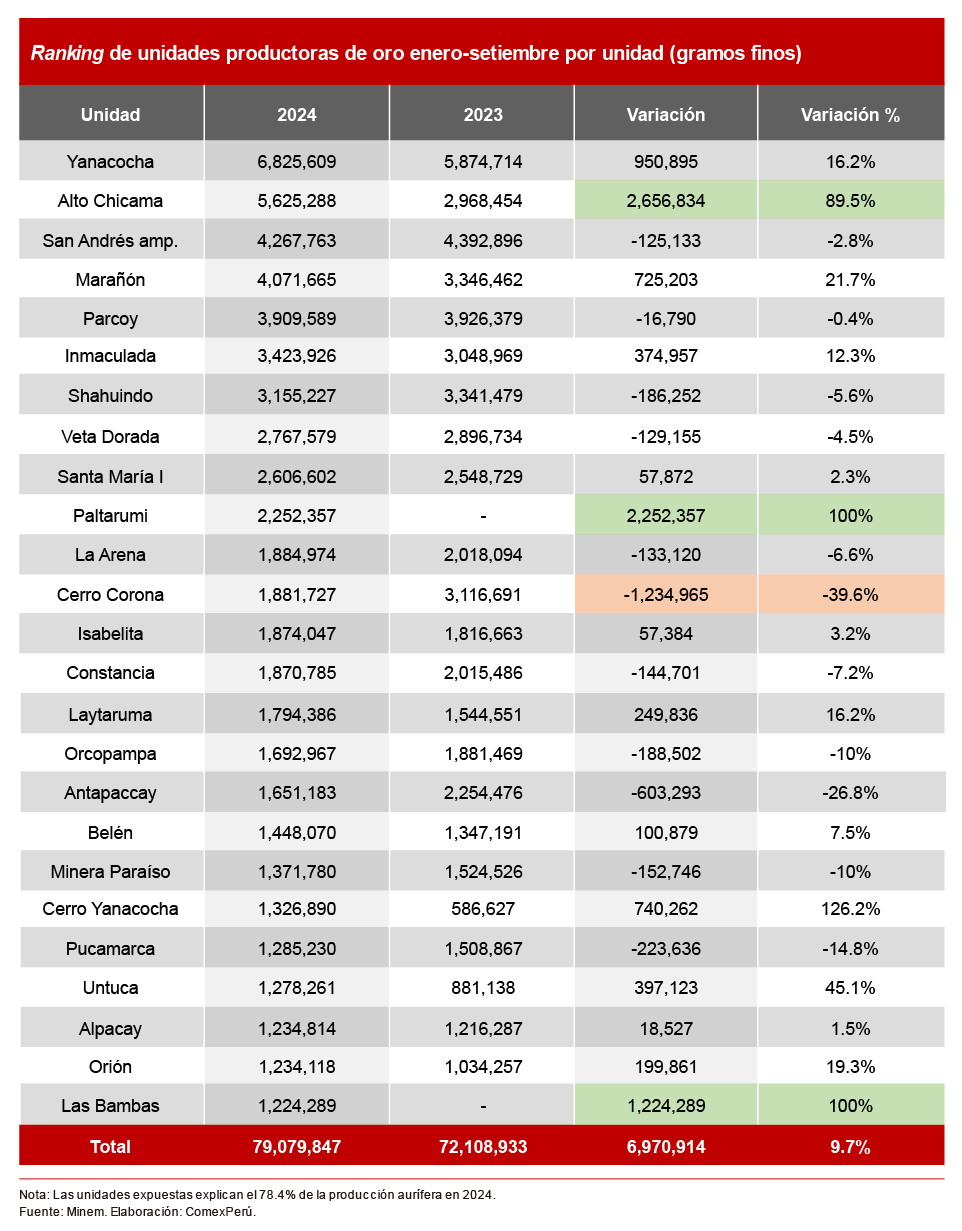 En contraste, la producción de oro registró un mejor desempeño, gracias al resultado de la unidad Alto Chicama (+89.5%), de la minera Booro Misquichilca, en La Libertad. A esto se le suma el inicio de operaciones en las unidades de Paltarumi, operada por la empresa del mismo nombre en Lima, y Las Bambas, en Apurímac. Ambas unidades explican el 4.4% de la producción a inicios de sus operaciones.
