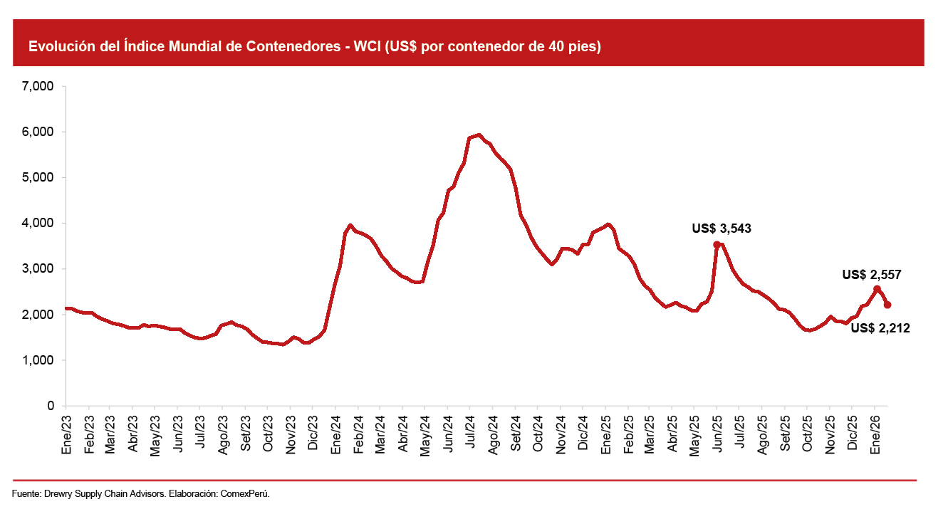 Dicho comportamiento alcista se acentuó en enero de 2026, cuando las tarifas alcanzaron un máximo de US$ 2,557/FEU el 8 de enero, para luego retroceder en las semanas siguientes y ubicarse en US$ 2,212/FEU al 22 de enero, una disminución del 10% por segunda semana consecutiva. Según Drewry, las tarifas empezarían a estabilizarse posterior al Año Nuevo chino si no hay ningún factor externo que genere un nuevo pico.