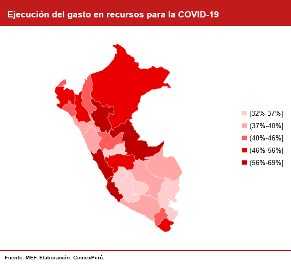 Al 8 de abril de 2021, se evidencian avances en la ejecución del gasto público en partidas relacionadas con el sector salud y la contención y respuesta frente a la COVID-19. Respecto del presupuesto asignado al sector, a nivel nacional, se observa un devengado de S/ 3,224 millones, lo que representa un nivel de ejecución del 24.2% con relación al presupuesto institucional modificado (PIM). Al observar con detalle esta misma variable en los gastos relacionados con la COVID-19 realizados por los Gobiernos regionales, destaca que Tacna, Junín, Loreto, Callao, San Martín, Lima, Ica y Ucayali sobrepasan el 50% de avance a menos de cuatro meses de iniciado el año.
