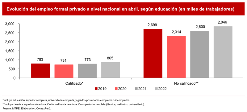 Además, dicho crecimiento esconde los bajos niveles de capacitación en el empleo formal, pues un total de 2,846,000 trabajadores del sector privado pertenecen a la categoría de no calificados en abril de este año, la cual refiere a bajos niveles educativos. En detalle, la cantidad de no calificados aumentó en 147,000 respecto de los niveles prepandemia, mientras que los calificados solo en 82,000. Es decir, el 76.7% de los trabajadores formales privados son no calificados, cifra que en el sector público formal asciende al 39.6%, lo que da un total aproximado de 602,044 casos.