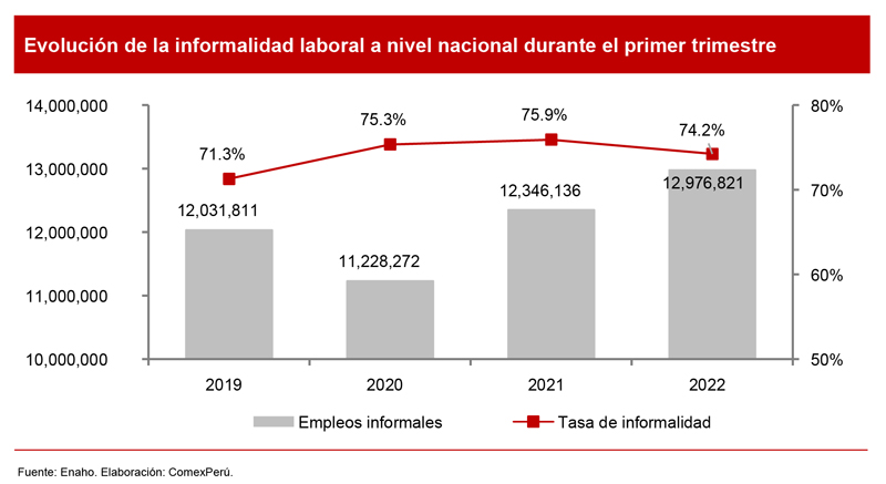 Además, lo que no debemos olvidar es que la gran mayoría del empleo a nivel nacional continúa siendo informal. Al respecto, la cantidad de trabajadores informales ascendió a 12,976,821 durante el primer trimestre del presente año, mientras que solo se registraron 4,504,498 formales, según cifras de la Encuesta Nacional de Hogares (Enaho). Es decir, la tasa de informalidad fue del 74.2%, una pérdida de seis años de progreso en la labor de reducir la informalidad, pues se asemeja a los resultados anuales de 2012 (74.3%).