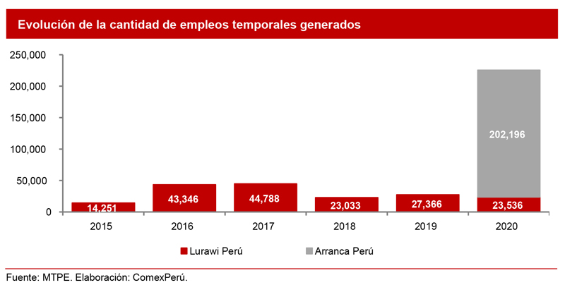 De acuerdo con información del mismo programa, que a la fecha solo ha publicado información hasta el 2020, la cantidad de empleos temporales generados en dicho año ascendió a 225,732, lo que significó un crecimiento considerable. Para esto fue necesaria la participación del programa Arranca Perú, que constituyó una respuesta a los estragos del aislamiento social y se fundó en junio de 2020; sin embargo, solo se caracterizó por actividades que tuvieron hasta dos meses de duración, según la memoria anual del programa.