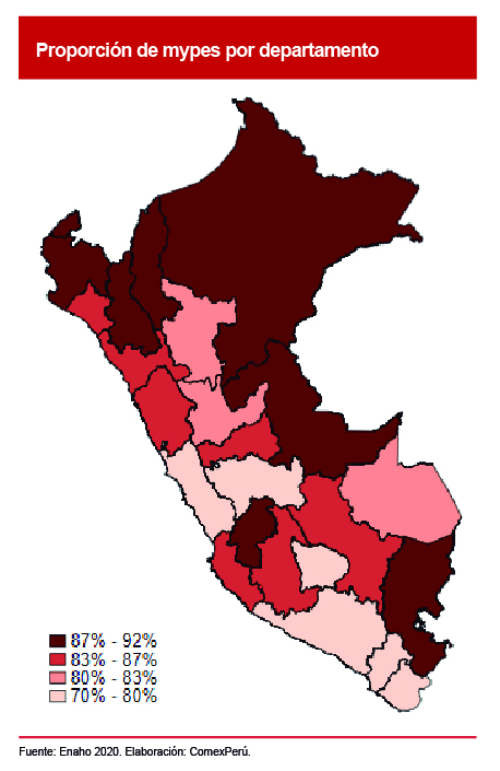 De acuerdo con cifras de la Enaho 2020, la mayor concentración de informalidad está en el norte y el oriente del país, así como en los departamentos de Huancavelica y Puno, en donde entre el 87% y el 92% de las mypes no están registradas en la Sunat. Por otro lado, en la zona sur del país y en los departamentos de Lima y Junín se ubican las mypes relativamente menos informales, en comparación con el promedio nacional.