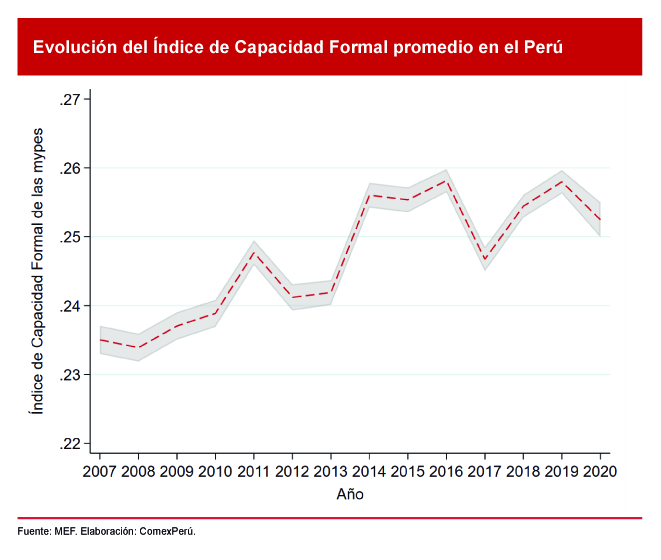 Las mypes en el Perú son ciertamente diversas y se encuentran vinculadas, en su mayoría, con el sector informal. No obstante, la crisis ocasionada por la COVID-19 ha ensombrecido el panorama, por lo que se vuelve más relevante analizar la relación entre la formalidad y el potencial de las mypes. Motivados por estas preguntas y el amplio margen que existe para mejorar la focalización de las políticas públicas en favor de las mypes, ComexPerú desarrolla el Índice de Capacidad Formal (ICF) de estas empresas.