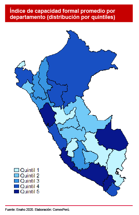 Según cifras de la Enaho 2020, los departamentos dentro del grupo con mayor ICF promedio en el país (quintil 5) se ubican en la costa centro y sur del país, y en el departamento de Madre de Dios. Es decir, en este último departamento, además de Áncash, Ica, Arequipa y Moquegua, existe una mayor proporción de mypes con alto nivel de capacidad formal. Esto se traduce en mejores prácticas contables, mayor propiedad de servicios para el desarrollo de actividades empresariales y mejores condiciones en su mano de obra.