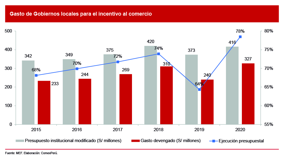 Un aspecto relevante es el gasto de los Gobiernos locales destinado a fomentar el comercio en los departamentos, especialmente a través de Infraestructura y equipamiento[1], Promoción del comercio interno[2] y Promoción del comercio externo[3]. Estas partidas tuvieron un presupuesto de S/ 416.2 millones en 2020, lo cual representó un aumento del 11.6% respecto de 2019. No obstante, dicho monto fue un 1% menor al destinado para el mismo objetivo en 2018.