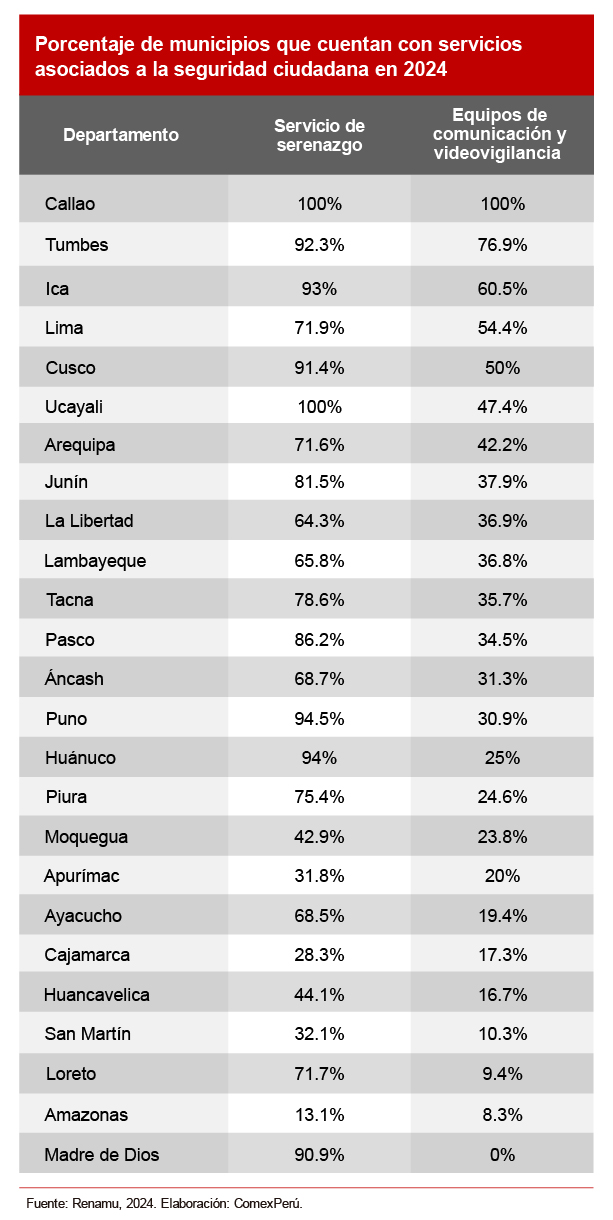 En 2024, el 65.8% de municipalidades a nivel nacional contó con servicio de serenazgo, según cifras del Registro Nacional de Municipalidades (Renamu). Sin embargo, las diferencias a nivel departamental son visibles. En la provincia constitucional del Callao y en Ucayali, el 100% de municipios cuentan con el servicio. Puno, Huánuco e Ica complementan el top 5 de departamentos en los que un mayor porcentaje de sus municipios cuentan con servicio de serenazgo, con el 94.5%, 94% y 93%, respectivamente. En el extremo opuesto, en Moquegua (42.9%), San Martín (32.1%), Apurímac (31.8%), Cajamarca (28.3%) y Amazonas (13.1%) se registran las tasas más bajas.
