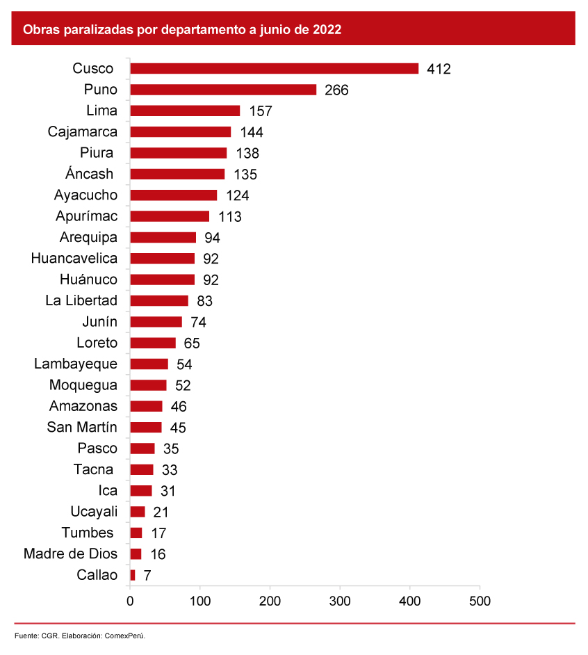 A nivel desagregado, los departamentos con mayor número de obras paralizadas son Cusco (412 obras), Puno (266) y Lima (157). Por otro lado, al comparar según montos de inversión de las obras paralizadas, La Libertad lidera la lista, con un total de S/ 4,684 millones; seguida por Arequipa (S/ 3,111 millones) y Cusco (S/ 2,782 millones).