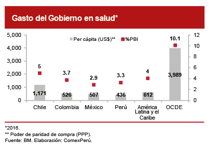 Sin embargo, pese a que el sector salud cuenta con mayores recursos, es necesario realizar ajustes en la provisión del servicio a la población. Así, de acuerdo con la Superintendencia Nacional de Salud, una de las causas de mayor disconformidad entre los ciudadanos es el acceso a los servicios de salud, pese a que, según el Instituto Nacional de Estadística e Informática (INEI), el 75.5% de la población cuenta con algún seguro, de los cuales, el 46.6% y 23.6% corresponden al Seguro Integral de Salud (SIS) y EsSalud, respectivamente, ambos administrados por instancias públicas.