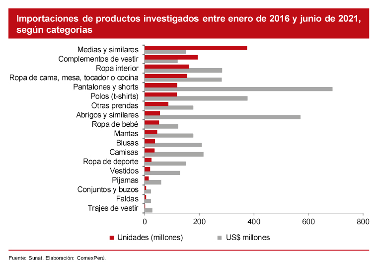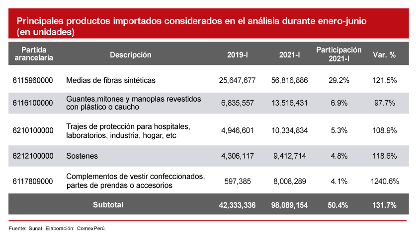 De acuerdo con la Sunat, durante el primer semestre de 2021, únicamente cinco de las 284 partidas arancelarias concentraron el 50.4% del total importado en unidades. En particular, las importaciones de medias de fibras sintéticas alcanzaron las 58,816,886 unidades (+121.5% respecto al mismo periodo de 2019) y explicaron el 29.2% del total importado. Como se mencionó, el análisis en unidades sobreestima el impacto de productos de bajo precio, de manera que la decisión de restringir el resto de las partidas arancelarias sería severamente influenciada por la mayor importación de medias.