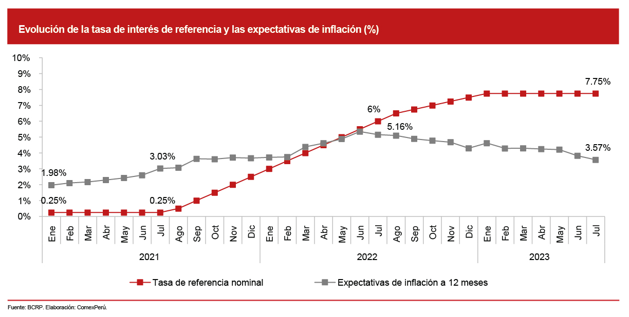 Por su parte, las expectativas de inflación a doce meses disminuyeron del 3.83% en junio al 3.57% en julio. Según el BCRP, esto indica que las personas y las empresas anticipan que la tasa de inflación será más baja de lo que se había pronosticado previamente. Así, esto puede influir en el comportamiento económico.