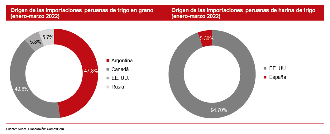 En el primer trimestre de este año, según cifras de la Sunat, las compras de trigo en grano de nuestro país provinieron de cuatro países: Argentina (268 toneladas; 47.8%), Canadá (228 toneladas; 40.6%), EE. UU. (32.5 toneladas; 5.8%) y Rusia (32.1 toneladas; 5.7%). Por su parte, las compras de harina de trigo provinieron de EE. UU. (0.18 toneladas; 94.7%) y España (0.01 toneladas; 5.3%).