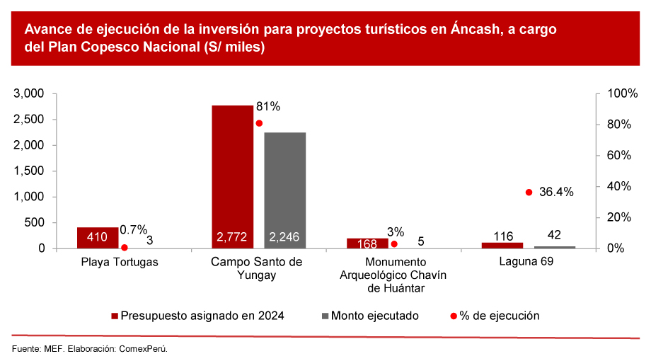 El Plan Copesco Nacional, entidad del Mincetur que administra y ejecuta los principales proyectos de inversión relacionados con el sector, tiene proyectos en Áncash por un monto total de inversión actualizado de S/ 60.6 millones, según cifras del Ministerio de Economía y Finanzas (MEF). Estos son obras para el mejoramiento de los servicios turísticos en la playa Tortugas, en la provincia de Casma (S/ 31.3 millones), que se prevén terminar en abril de 2026; el mejoramiento y creación de servicios turísticos en el Campo Santo de Yungay (S/ 25.9 millones; enero de 2026); obras de infraestructura en el Monumento Arqueológico Chavín de Huántar (S/ 2.2 millones; sin fecha prevista de cierre); y obras de infraestructura, reparación de sendero y actividades en la laguna 69 (S/ 1.2 millones; mayo de 2025).