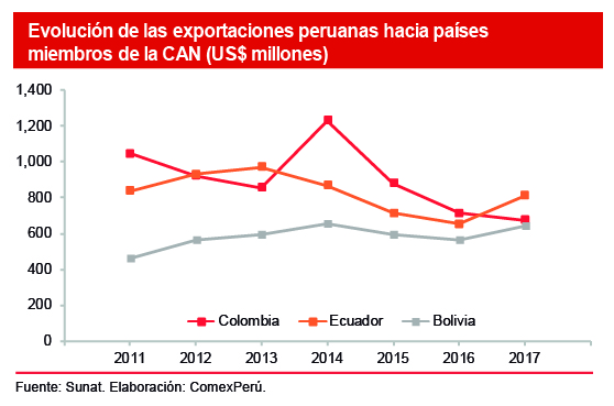 Según cifras de la Sunat, en 2017, el Perú realizó envíos a este bloque por US$ 2,128 millones, un 4.8% del total de nuestras exportaciones, lo que muestra un crecimiento del 10% con respecto a 2016. De dicho monto, US$ 813.3 millones se dirigieron a Ecuador (+24.7%), US$ 673.6 millones a Colombia (-5.4%) y US$ 641.5 millones a Bolivia (+13.9%). Por su parte, los productos que impulsaron este crecimiento fueron los materiales y desperdicios vegetales utilizados para la alimentación de animales (+49.4%), el alambre de cobre refinado (+28.9%) y los aceites de petróleo (+149.4%). Como se puede observar en el gráfico, el desempeño positivo de nuestras exportaciones hacia Ecuador y Bolivia en el último año revirtió caídas de cuatro y tres años consecutivos, respectivamente. Sin embargo, no todas son noticias positivas, pues nuestras exportaciones hacia Colombia continúan cayendo.