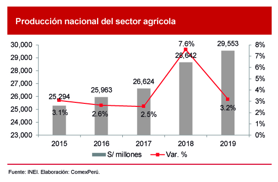 Según cifras del Instituto Nacional de Estadística e Informática (INEI), en 2019, el sector agrícola generó S/ 29,553 millones, un 5.4% del PBI total en dicho año. Con la información disponible hasta setiembre último, podemos afirmar que los resultados del sector también han sido importantes en 2020, y han logrado consolidarse como uno de los principales motores productivos de nuestra economía. En primer lugar, se resalta que en el período enero-setiembre de 2020 el sector generó ingresos tributarios de S/ 475 millones, un 4.8% más que en el periodo enero-setiembre de 2019, según cifras de la Sunat. Por otro lado, al ser intensivo en mano de obra, en el tercer trimestre de 2020, un 32.9% de la población ocupada se encontraba dentro del sector, según el INEI. Además, fue la única actividad económica en experimentar crecimiento en la población ocupada en el tercer trimestre de 2020 respecto de 2019 (+20.5%).