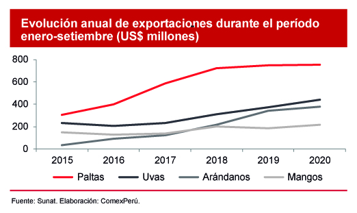 Otro resultado importante es el de las exportaciones. El sector agrícola no tradicional fue el segundo, después de minería, en generar una mayor entrada de divisas (US$ 4,431 millones) en el período enero-setiembre de 2020. Además, el valor de sus exportaciones creció un 2.8% respecto de 2019; esto se explica por los buenos resultados en productos estrella como paltas (US$ 751 millones, +0.1%), uvas (US$ 442 millones, +19.3%), arándanos (US$ 375 millones, +9.28%) y mangos (US$ 215 millones, +16.5%). Otros productos que destacaron fueron el jengibre (US$ 54 millones, +103.6%), las mandarinas (US$ 45 millones, +32.3%) y las naranjas (US$ 9 millones, +52%).