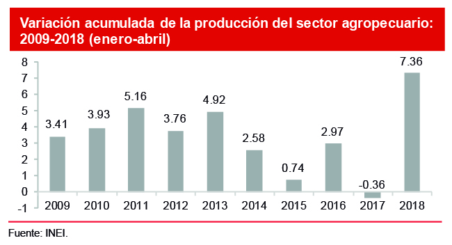 Según cifras del Instituto Nacional de Estadística e Informática (INEI), la producción nacional en el periodo enero-abril de 2018 creció un 4.4% con respecto al mismo periodo de 2017. Así, luego del sector pesca, que registró un dinamismo del 26.98%, el agropecuario alcanzó un crecimiento del 7.36%, con lo que se recuperó de la caída mostrada en el mismo periodo de 2017 (-0.36%).