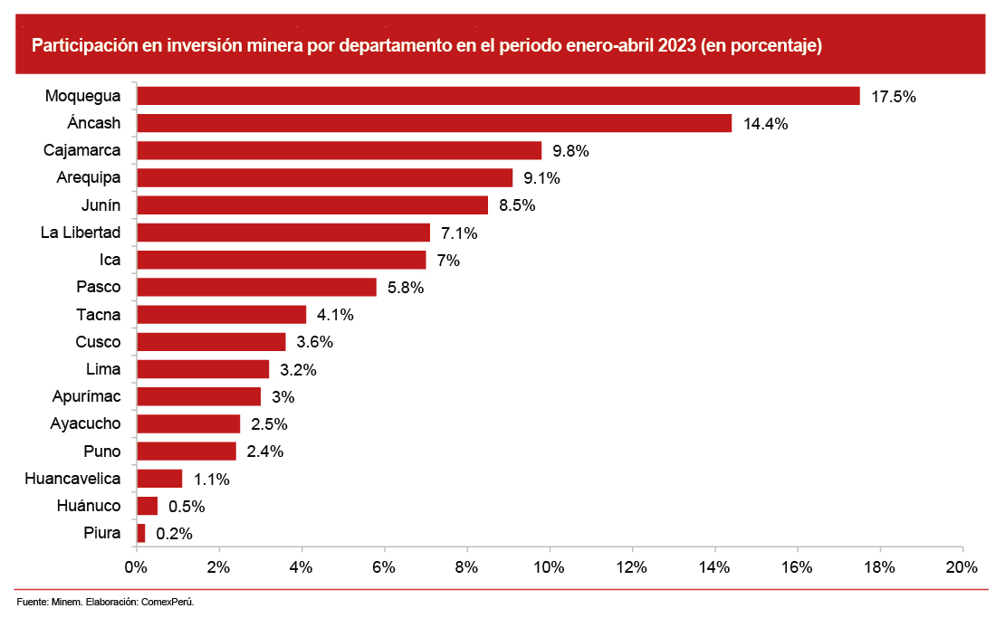 A nivel geográfico, el Minem registra a Moquegua como el departamento con mayor inversión minera durante estos cuatro primeros meses del año, con US$ 204 millones, un 17.5% del total de la inversión. Le siguen Áncash (US$ 169 millones; 14.4%), Cajamarca (US$ 114 millones; 9.8%), Arequipa (US$ 107 millones; 9.1%), Junín (US$ 100 millones; 8.5%) y La Libertad (US$ 84 millones, 7.1%).