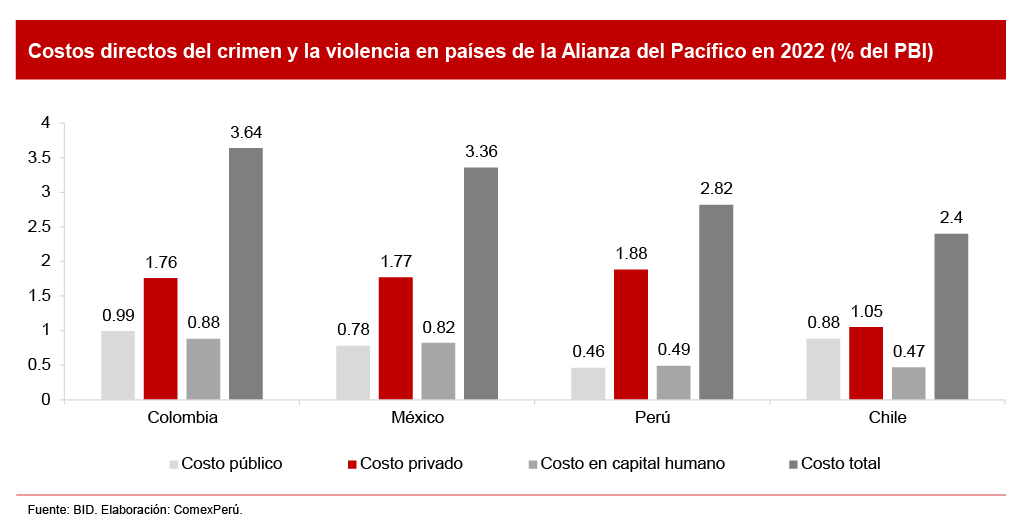 Mientras que el costo público promedio de estos hechos asciende al 0.46% del PBI peruano, por debajo del promedio de la región (1.08%), el costo privado es superior y representa el 1.88% del PBI, por encima del promedio de la región (1.6%). Incluso, el costo privado en el Perú es el mayor entre los países de la Alianza del Pacífico.