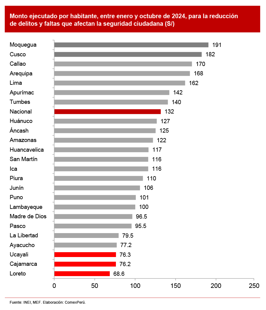 Al desagregar el gasto en seguridad a nivel departamental, observamos resultados heterogéneos. Entre enero y octubre de 2024, los departamentos con mayor ejecución por habitante de su presupuesto fueron Moquegua (S/ 191), Cusco (S/ 182) y la provincia constitucional del Callao (S/ 170). En contraste, Ucayali (S/ 76.3), Cajamarca (S/ 76.2) y Loreto (S/ 68.6) registran el menor gasto per cápita. Solo siete departamentos —incluyendo la provincia constitucional del Callao— presentan un gasto por habitante por encima del promedio nacional.