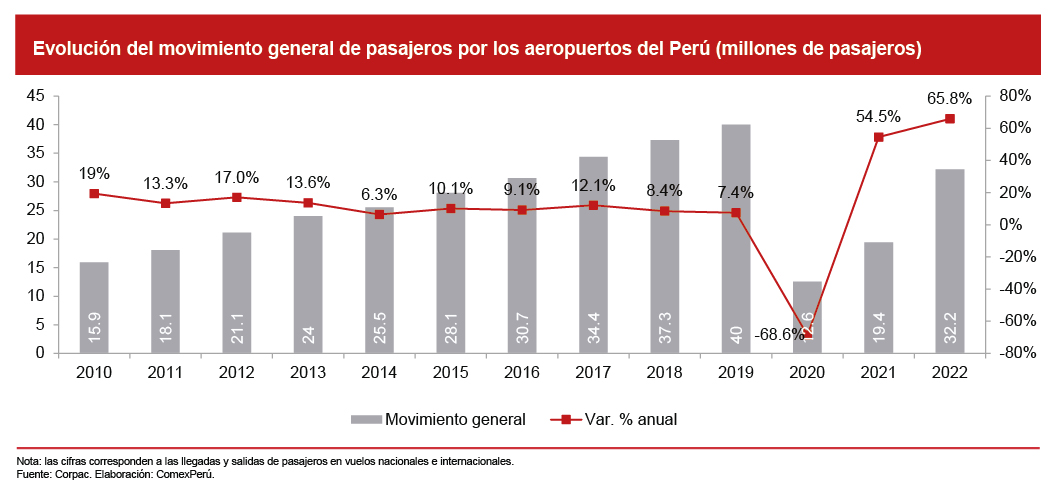 El transporte aéreo fue afectado por las continuas restricciones de movilización decretadas por el Gobierno para evitar la propagación de la COVID-19. Así, en 2020, el movimiento general de pasajeros por los aeropuertos del Perú cayó un 68.6%, al pasar de 40 millones en 2019 a 12.6 millones. En 2022, 32.2 millones de pasajeros transitaron por los aeropuertos, un 65.8% más que en 2021 (19.4 millones), aunque un 19.6% por debajo de 2019 (40 millones).