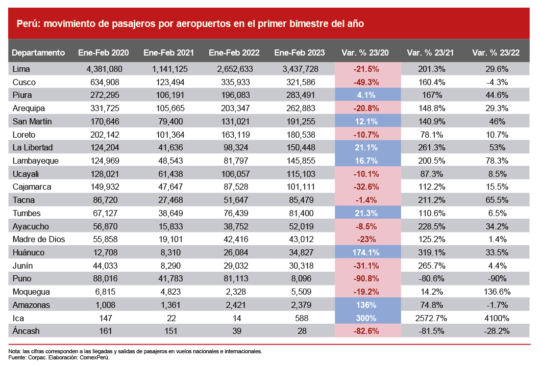 A nivel departamental, sin considerar Lima, entre los departamentos con mayor movilización de pasajeros por sus aeropuertos se encuentra el Cusco, con 321,586 pasajeros movilizados en el primer bimestre de 2023, un 4.3% menos que en similar periodo de 2022. Completan la lista del top 5 Piura (283,491 pasajeros; +44.6%), Arequipa (262,883; +29.3%), San Martín (191,255; +46%) y Loreto (180,538; +10.7%).