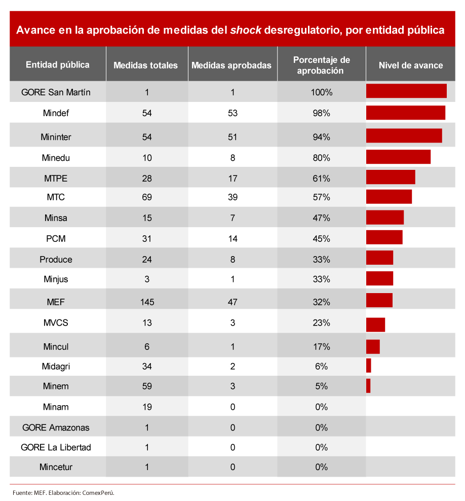 El punto de partida fue un diagnóstico conocido: la inversión —pública y privada— está limitada por una excesiva regulación y una débil articulación entre sectores, lo que fragmenta competencias, multiplica requisitos y frena el crecimiento económico, según el exministro Salardi. En respuesta, el MEF lanzó un primer paquete con 400 medidas. A la fecha, el total de medidas asciende a 568, de las cuales el 45% ya han sido aprobadas formalmente y el 55% restante se encuentra en proceso[1], de acuerdo con el MEF.