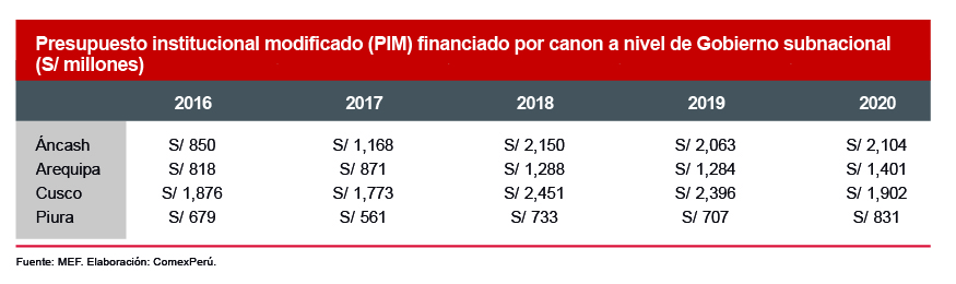 Si se tiene en cuenta que la economía peruana ha crecido a una tasa promedio anual del 5.6% y el 4% para los periodos 2001-2010 y 2011-2019, respectivamente, la problemática social en nuestro país no sería producto de la falta de recursos generados por los distintos sectores de la economía, sino que estaría vinculada con su uso eficiente. Un ejemplo de esto serían los recursos transferidos por concepto de canon, un mecanismo de redistribución de riqueza que constituye una fuente de ingreso importante para algunos Gobiernos regionales y locales. El canon representa la participación de la que gozan estos últimos sobre los ingresos y las rentas obtenidos por el Estado por la explotación de recursos naturales. Según la Ley 27506, este recurso económico resultante de la actividad extractiva privada debe ser utilizado principalmente para el financiamiento de proyectos de infraestructura, a fin de generar productividad en las localidades, de forma tal que se retribuya por la extracción de los recursos naturales.