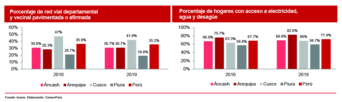 Según los resultados del Incore, Piura ha sido el departamento con peor desempeño entre los cuatro analizados. En 2016, el porcentaje de la red vial departamental y vecinal pavimentada o afirmada de Piura fue del 20.7% (puesto 22 de 25), 15.2 pp. por detrás del porcentaje nacional. Por otro lado, el porcentaje de hogares con acceso a electricidad, agua y desagüe de Piura para el año 2016 fue del 56.8%, 10.9 pp. por detrás de la proporción a nivel nacional. Cabe resaltar que el departamento se vio perjudicado por el Fenómeno de El Niño (FEN) de 2017, el cual agudizó las brechas en dicho departamento. Por ejemplo, el porcentaje de hogares con acceso a electricidad, agua y desagüe tan solo aumentó en 1.9 pp., mientras que el porcentaje de la red vial departamental y vecinal pavimentada o afirmada retrocedió 1.9 pp.