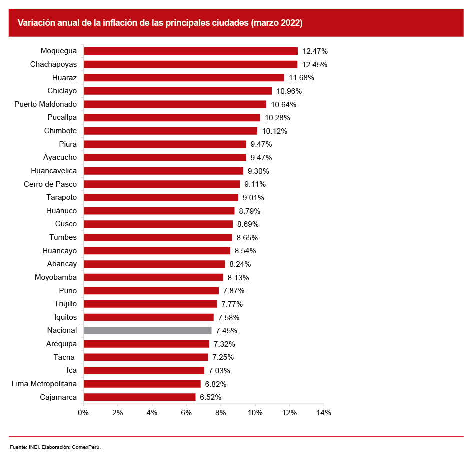 Sin embargo, el impacto de la inflación no es igual para todos y ello se evidencia a través del incremento de precios en las principales ciudades a lo largo del país. Mientras que, a nivel nacional, la inflación a 12 meses de marzo alcanzó el 7.45%, 21 ciudades registran tasas superiores y, peor aún, en siete ciudades la inflación interanual superó el 10%. Estas son Moquegua (12.5%), Chachapoyas (12.5%), Huaraz (11.7%), Chiclayo (11%), Puerto Maldonado (10.6%), Pucallpa (10.3%) y Chimbote (10.1%).