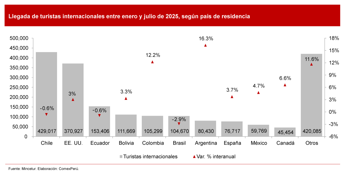 Ecuador y Bolivia se ubicaron detrás de Chile y EE. UU. en el ranking de países emisores de turistas internacionales que arribaron al Perú entre enero y julio de 2025. En comparación con el mismo periodo de 2024, los mayores crecimientos se registraron en los turistas residentes de Argentina (+16.3%) y Colombia (+12.2%). En contraste, Chile, Ecuador y Brasil presentaron caídas (-0.6%, -0.6% y -1.6%, respectivamente).
