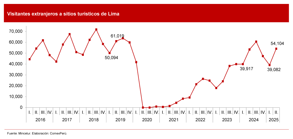 En el primer semestre de 2025, del total de visitas a atractivos turísticos de Lima, el 32.9%[1] fueron extranjeros, lo que representa una ligera caída del 0.1% frente al mismo periodo de 2024, según cifras del Mincetur. Entre ellos, el Museo de Sitio de la Huaca Pucllana destaca en concurrencia por el público internacional, con 68,530 ingresos entre enero y junio. El departamento de Lima alberga al menos 14 sitios turísticos[2], que incluyen nueve museos, dos reservas, un refugio, la Ciudad Sagrada de Caral y el Circuito Mágico del Agua, lo que conforma una oferta cultural variada.