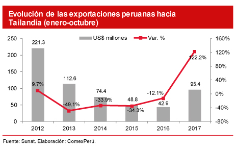 No obstante, en el periodo enero-octubre del presente año, nuestras exportaciones a Tailandia ascendieron a US$ 95.4 millones, un 122.2% más que el valor alcanzado en el mismo periodo de 2016. Cabe resaltar que nuestros envíos registrados a octubre de este año superan al valor de las exportaciones anuales de los últimos 3 años (US$ 92.6 millones en 2014, US$ 67.2 millones en 2015 y US$ 63 millones en 2016). Así, se esperaría que, para los próximos años, incluso superemos los niveles alcanzados en 2012.