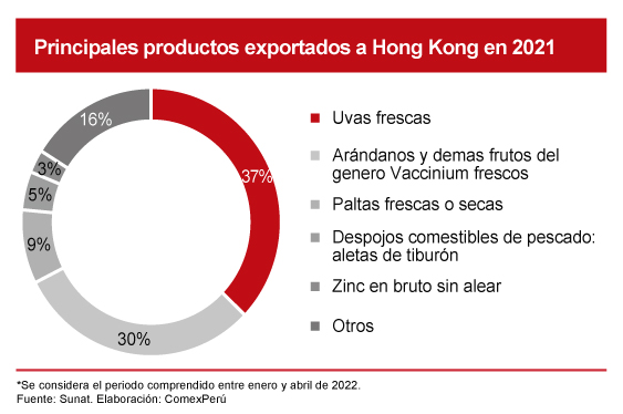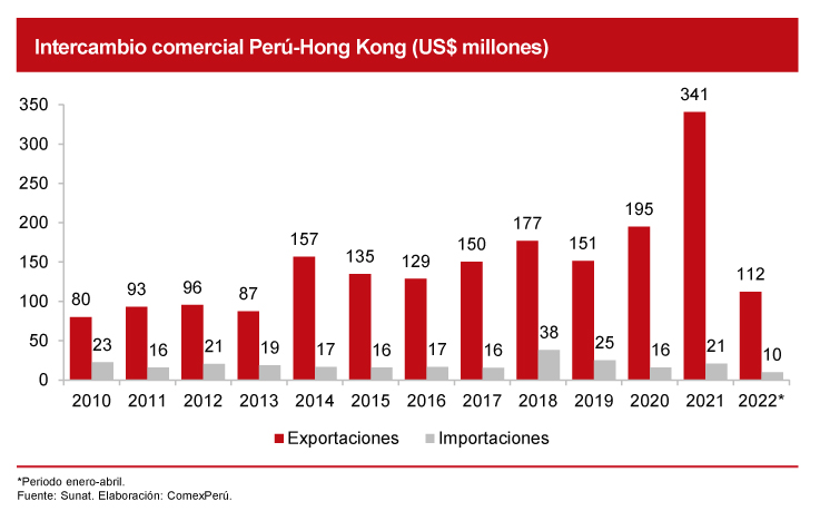 Si desagregamos nuestras exportaciones a estos países, en el caso de Hong Kong sobresale que el 93.4% del monto total en 2021 correspondió al sector no tradicional, es decir, US$ 319 millones. De este valor, US$ 285 millones pertenecieron al sector agropecuario.