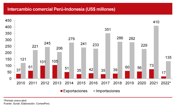 Las cifras de la Sunat de exportaciones e importaciones muestran dos situaciones opuestas. En el caso de Hong Kong, contamos desde hace varios años con una balanza comercial positiva, pues nuestras exportaciones son significativamente superiores. Sobresale el incremento en 2021 (+74.6%), cuando se alcanzó un valor de US$ 341 millones. En cambio, nuestra balanza comercial con Indonesia es negativa, ya que importamos mucho más de lo que exportamos; en 2021, nuestras importaciones registraron un monto de US$ 410 millones (+78.7%), mientras que nuestros envíos fueron solamente de US$ 73 millones. De esta manera, no sorprende que el último año Hong Kong ocupase el puesto 22 en el ranking de países a los que exportamos e Indonesia fuese el 43; pero en términos de orígenes de las importaciones, el primero tuvo el puesto 70 y el segundo, el puesto 21.
