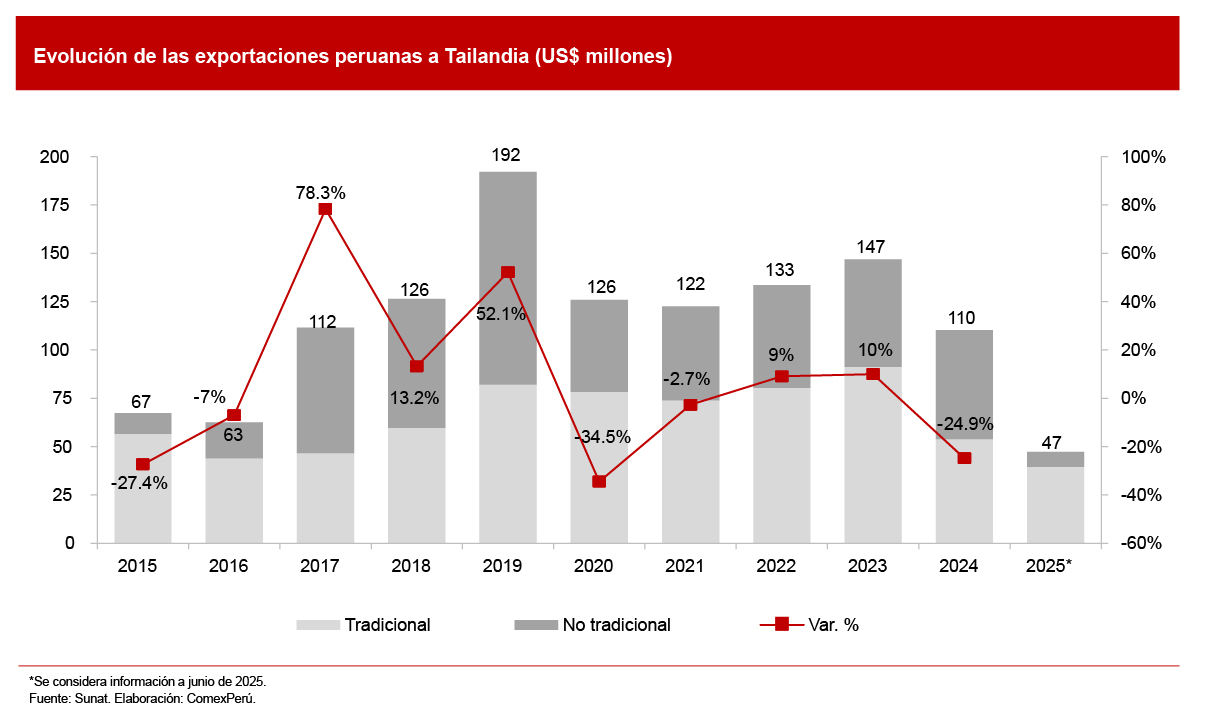 De acuerdo con cifras de la Sunat, el intercambio comercial con Tailandia en el periodo enero-junio de 2025 sumó US$ 394.8 millones, lo que evidenció un crecimiento del 30.5% con respecto al mismo periodo del año anterior.
