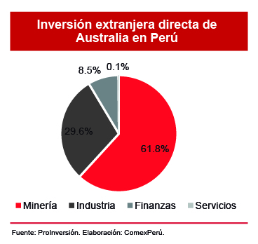 Por otro lado, el acuerdo comercial posiciona al Perú como un país atractivo para el ingreso de inversiones de capital australiano. De acuerdo con cifras de ProInversión, la inversión extranjera directa de Australia en el Perú alcanza actualmente los US$ 7.6 millones, de los cuales US$ 4.7 millones corresponden al sector minero; US$ 2.2 millones, al sector industria; US$ 638,826, al sector finanzas, y US$ 9,731, al sector de servicios.