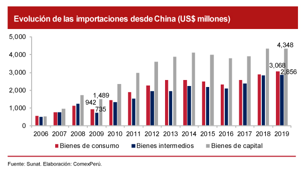 En cuanto a la estructura de nuestras exportaciones, estas se concentran principalmente en el rubro tradicional (95.5% del valor exportado en 2019), dentro del cual predominan los envíos de productos mineros (90%). De esta manera, el 87% de los envíos peruanos a China se clasifican como bienes intermedios que son utilizados como materias primas para la industria. Por el lado de nuestras importaciones (predominantemente, manufacturas), un 42.3% son bienes de capital destinados principalmente a la industria, el transporte y la construcción. Esta distribución refleja un componente fundamental en los beneficios que este TLC ha traído al Perú, ya que deja en claro cómo el libre comercio permite potenciar la riqueza generada por industrias peruanas con ventaja comparativa, a la par de contar con nuevos productos que sirven como insumos para la industria local. Esto último significa nuevas tecnologías e innovaciones sin sobrecostos al alcance de todos los peruanos, lo que permite elevar nuestra competitividad.