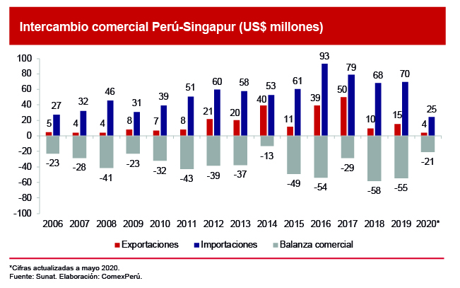 De acuerdo con cifras de la Sunat, en el periodo 2009-2019, las exportaciones peruanas a Singapur mostraron un crecimiento anual promedio del 48%, hasta alcanzar un valor de US$ 15 millones en 2019. De este monto, US$ 5.2 millones correspondieron a envíos del rubro tradicional o primario (35% del total) y US$ 9.8 millones, a envíos del rubro no tradicional o manufacturados (65%).