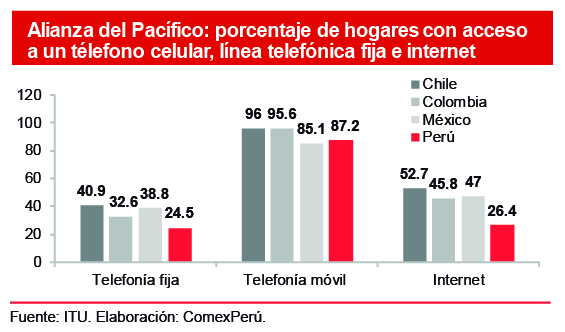 No obstante, nos encontramos muy rezagados respecto de nuestros pares de la Alianza del Pacífico – AP (bloque que conformamos con Chile, Colombia y México) en los pilares asociados con la adopción de infraestructura y tecnología de telecomunicaciones del Índice de Competitividad Global, elaborado por el Foro Económico Mundial. Por ejemplo, ocupamos el puesto 81 respecto de suscripciones de banda ancha de internet, mientras que Chile ocupa el puesto 55 y Colombia y México, el 64 y 62, respectivamente. De igual forma, nos encontramos en el último lugar de la AP en cuanto a suscripciones de telefonía fija, y en el penúltimo en telefonía móvil. Asimismo, según cifras de la Unión Internacional de Telecomunicaciones (ITU, por sus siglas en inglés) de las Naciones Unidas, la proporción de hogares peruanos con acceso a telefonía (móvil y fija) e internet está por debajo de la de sus pares de la AP.