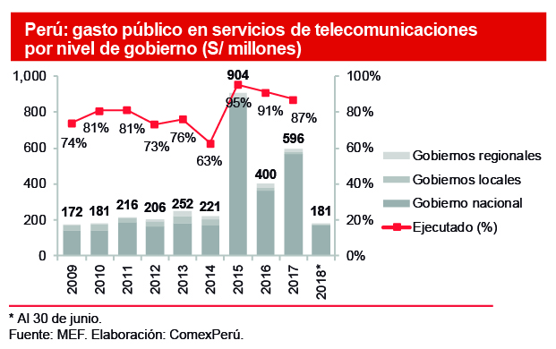 De acuerdo con AFIN, invertir los recursos necesarios para cerrar la brecha nos acercaría recién en 2020 a los países de la AP. Contrariamente, en el Perú, la inversión (pública y privada) promedio entre 2008-2015, en el sector de telecomunicaciones, fue de un 0.47% del PBI, por debajo del promedio de los países de América Latina y el Caribe (0.61%), según cifras del Banco Interamericano de Desarrollo. Asimismo, el gasto público para mejorar y ampliar la cobertura de las telecomunicaciones (que representó el 0.4% del total), concentrado en el Gobierno nacional, ha sido errático, con una caída en su ejecución desde 2015 y un retroceso del 22% en junio de 2018, respecto de lo ejecutado en 2017.