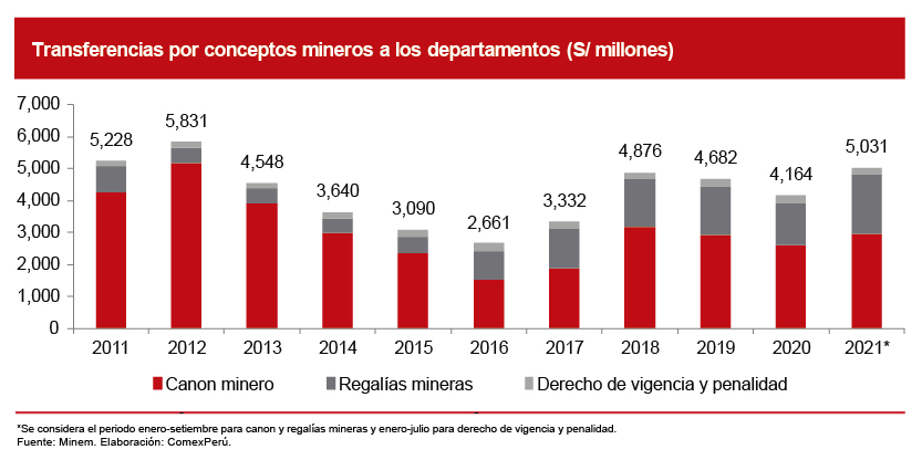 De igual forma, de acuerdo con el último boletín estadístico minero del Ministerio de Energía y Minas (Minem), las transferencias por conceptos mineros a los departamentos en 2021 suman un valor de S/ 5,031 millones, el valor más alto desde 2013. De estos, S/ 2,947 millones corresponden a canon minero (58.6% del total); S/ 1,880 millones, a regalías mineras (37.4%); y S/ 204 millones, a derecho de vigencia y penalidad (4.1%).