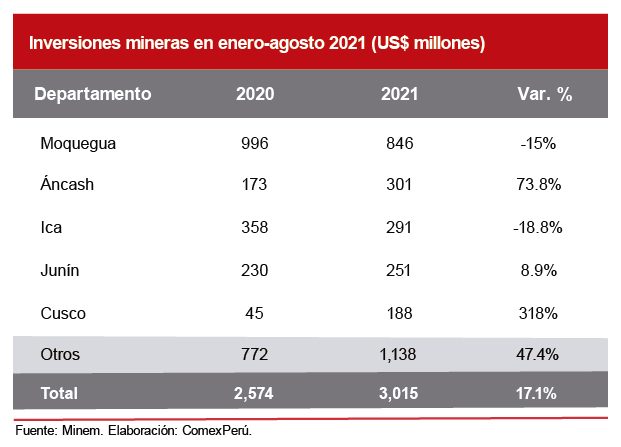 Por otro lado, la inversión minera en enero-agosto de 2021 fue de US$ 3,015 millones y creció un 17.1% respecto de los US$ 2,574 millones invertidos en el mismo periodo de 2020. En lo que respecta a los departamentos que más se beneficiaron con inversiones en el sector, lideran la lista Moquegua, con US$ 846 millones (-15% respecto del mismo periodo del año anterior); Áncash, con US$ 301 millones (+73.8%), e Ica, con US$ 291 millones (-18.8%).