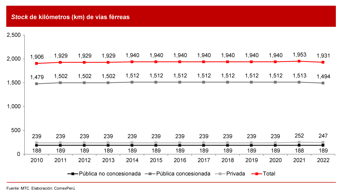 El desarrollo de la infraestructura ferroviaria se estancó desde 2010. Los kilómetros de vías férreas aumentaron apenas un 2% en catorce años. Los ferrocarriles son el sistema de transporte de gran volumen y menores costos que debería conectarse con las carreteras, según el propio Ministerio de Transportes y Comunicaciones (MTC).