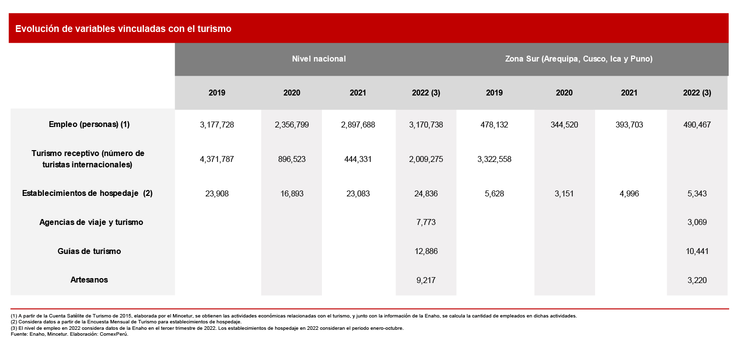 A nivel departamental, Arequipa, Cusco, Ica y Puno concentran un 15.5% del total de empleo en el sector. En cuanto a la infraestructura privada, a octubre del año pasado, había 24,836 establecimientos de hospedaje a nivel nacional. De estos, un 21.5% se ubican en los departamentos mencionados (5,343 establecimientos). Además, según el directorio nacional de prestadores de servicios turísticos calificados, existen 7,773 agencias de viaje y turismo a nivel nacional. De estas, un 39.5% se ubican en la zona de mayor conflictividad social (Arequipa, Cusco, Ica y Puno).