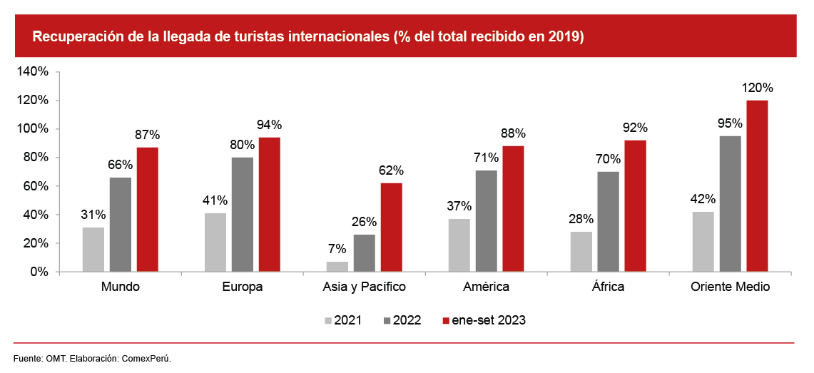 La entidad estima que las llegadas internacionales habrían alcanzado los 1,300 millones al cierre de 2023, lo que significaría un incremento del 33% respecto de 2022, y una recuperación del 90% respecto de los niveles prepandemia. Asimismo, los ingresos generados por el turismo internacional habrían alcanzado los US$ 1.4 billones en 2023, lo cual implicaría una recuperación del 93% frente a los US$ 1.5 billones registrados en 2019.
