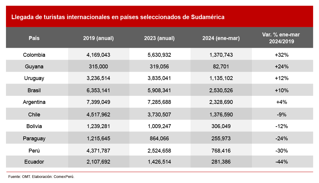 El turismo internacional se encuentra muy cerca de alcanzar las cifras prepandemia. Entre enero y marzo de 2024, recuperó el 97% de los niveles registrados en 2019, según datos de la Organización Mundial del Turismo (OMT). África, Europa y Medio Oriente ya superaron las cifras de 2019, mientras que en Sudamérica la recuperación alcanzó el 99.8%. Asimismo, Colombia encabeza la lista de recuperación de turistas internacionales en la región. No solo alcanzó las cifras prepandemia, sino que las superó en un 32%, según cifras de la OMT. Otros países en los que el turismo receptivo se recuperó por completo son Guyana (+24%) y Uruguay (+12%). Por su parte, los países que tuvieron menor recuperación fueron Ecuador (-44%), Perú (-30%) y Paraguay (-24%). En conjunto, toda la región presenta una recuperación del 99.8% a marzo de este año, por lo que la recuperación total del turismo receptivo en la región se concretaría este año.