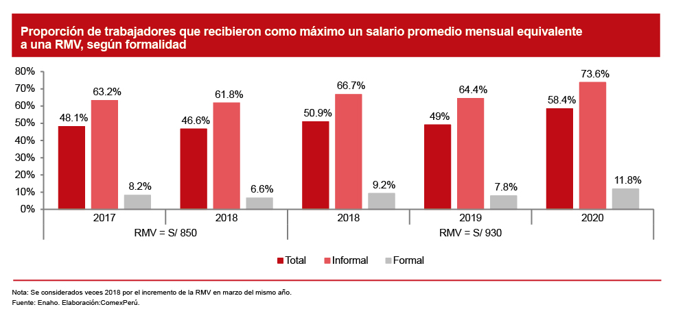 Por ello, a pesar de la necesidad de recuperar los niveles de ingreso de las familias, es necesario reconocer que nuevos incrementos en la RMV no son la solución, además que su aplicación sería severamente limitada por la apremiante informalidad que caracteriza al mercado laboral peruano. Inclusive, aumentar las exigencias para la creación de empleos adecuados solo desembocará en una mayor carencia de estos y una mayor exclusión de los trabajadores menos capacitados, aquellos fueron más perjudicados por la pandemia.