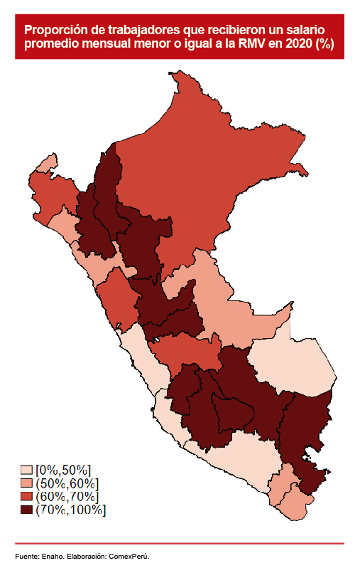 Desafortunadamente, esta situación se agrava en diez departamentos donde más del 70% de los trabajadores del año pasado recibieron un salario promedio mensual menor o igual a la RMV: Amazonas, Apurímac, Ayacucho, Cajamarca, Cusco, Huancavelica, Huánuco, Pasco, Puno y San Martín. El peor resultado perteneció a Huancavelica, donde el 87.3% de sus trabajadores, un total de 245,096 casos, laboraron en dicha condición, aunque esto no sorprende al considerar que el salario promedio del departamento alcanzó apenas los S/ 647, lo que significa una reducción del 12.9% respecto de los S/ 742 registrados en 2019. Seguidamente, se ubicó Cajamarca con una incidencia del 81.6% (692,320 trabajadores) y un salario promedio mensual de S/ 832, mientras que Puno ocupó el tercer lugar, con una proporción del 78.8% (627,243 casos) y un promedio salarial de S/ 798.